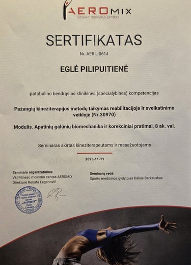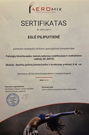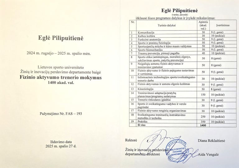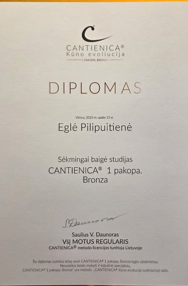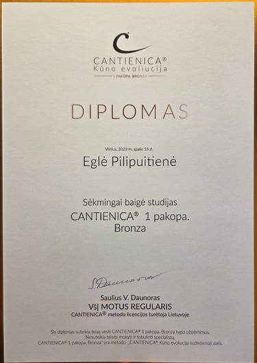 Esu baigusi CANTIENICA® metodo mokymus, skirtus kūno formoms ir laikysenai gerinti, taip pat Lietuvos Sporto Universitete įgijau fizinio aktyvumo trenerės kvalifikaciją.
